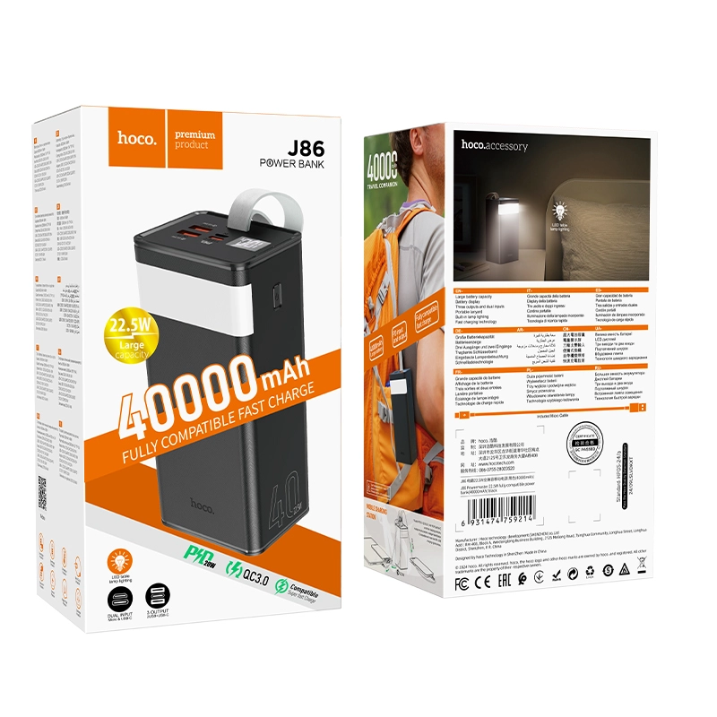 With its ultra-high 40000mAh power bank capacity and a rated capacity of 23600mAh, the Hoco J86 ensures multiple full charges for smartphones, tablets, and other USB-powered devices. Whether you’re on a long journey, camping outdoors, or need a backup solution during power outages, this power bank has your back.